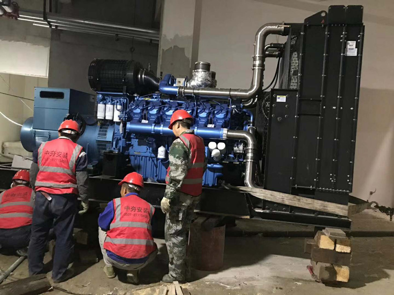 我公司安排的专业安装人员和调试人员一起跟随到达济南传染病医院。由于医院现场的特殊性,需要先将发电机组安放到机房,在机房内进行静音箱安装。