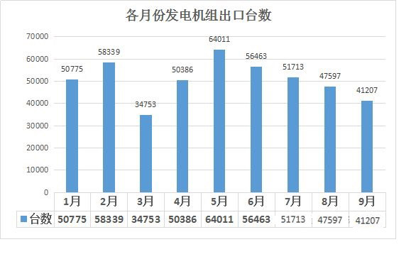 2015年1—9月份,国内2124家发电机组出口企业,共完成15379笔出口贸易,销售455244台发电机组,完成销售额1445984280美元,涉及124个国家,其中中东和东南亚仍然是重点市场。